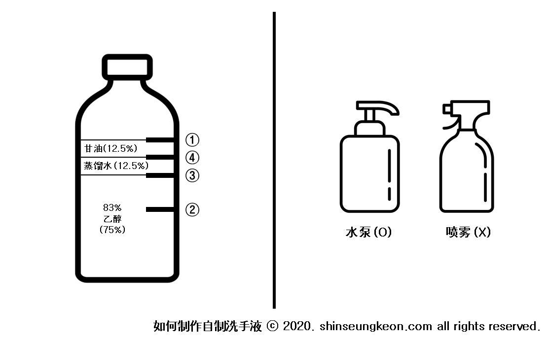- 根据上述组合,用蒸馏水和甘油稀释83%的乙醇,最终浓度为62.25%。 这与市场上的凝胶型洗手液浓度完全相同。